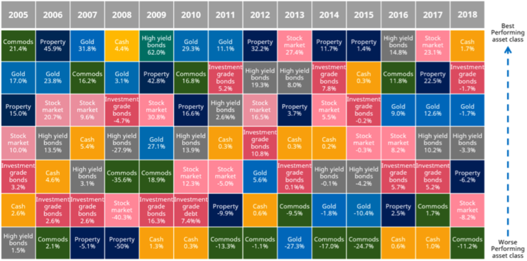 Het belang van spreiding kan niet genoeg benadrukt worden, stelt Johanna Kirklund, hoofd multi-asset beleggingen bij Schroders. Voor beleggers kan het verleidelijk zijn om vast te houden aan wat je hebt. Het is een beleggingsstrategie die wordt gepropageerd door succesvolle beleggingspioniers zoals Warren Buffett. Het is echter ook belangrijk voor beleggers om de voordelen van diversificatie te overwegen. Aan de hand van de tabel hieronder geeft Kirklund inzicht in de prestaties van verschillende beleggingscategorieën sinds 2005. Daaruit blijkt dat de diverse categorieën per jaar heel verschillend presteren. Spreiding helpt om de risico’s te beperken en de prestaties van een portefeuille op de lange termijn te verbeteren.