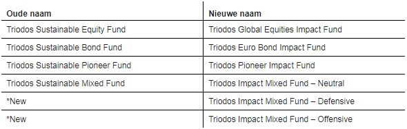 De sterke toename van het aanbod van duurzame beleggingsproposities, heeft bij Triodos IM geleid tot een behoefte aan een meer specifieke duiding van de positieve impact benadering die wordt toegepast door al haar fondsen, inclusief haar beursgenoteerde aandelen- en obligatiefondsen. Als gevolg daarvan zullen deze fondsen een naamswijziging krijgen met als doel om daarmee beter aan sluiten bij hun onderliggende impact investing propositie.