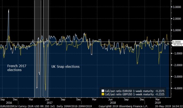 Hieronder volgt een commentaar in het Engels van Bart Hordijk, valuta-analist bij Monex Europe, op de invloed van de Europese Parlementsverkiezingen op de euro. De verwachting is dat die beperkt zal zijn, wat ook zichtbaar is in de vraag naar opties die beschermen tegen neerwaartse bewegingen van de euro. Hetzelfde geldt voor het Britse pond, hoewel een gunstige uitslag voor de Brexit Partij van Nigel Farage wel eens een teken aan de wand kan zijn dat markten momenteel de kans op een harde Brexit onderschatten. Dit kan het Britse pond mogelijk naar het spreekwoordelijke zuiden sturen – en dat is niet in de zin van een zonnig bezoek aan de Spaanse Costas.