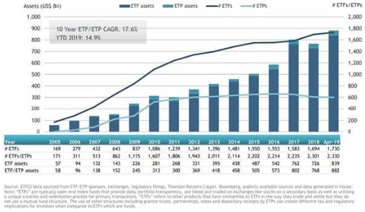 ETFGI reports assets invested in the European ETF and ETP industry reached a record 882.20 billion US dollars at the end of April 2019
