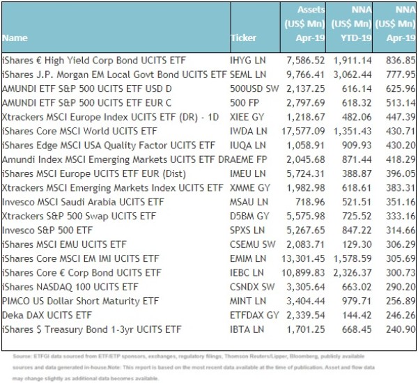 Substantial inflows can be attributed to the top 20 ETF's by net new assets, which collectively gathered $8.21 Bn in April, the iShares € High Yield Corp Bond UCITS ETF gathered $836.85 Mn alone.