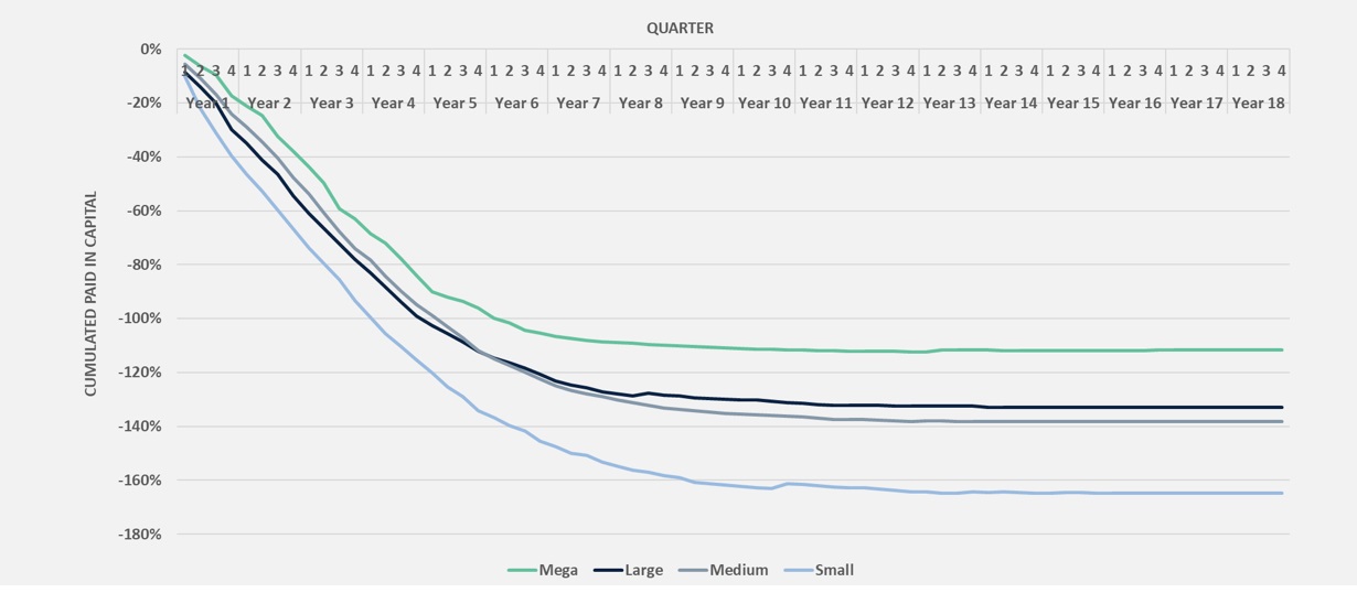 Regardless of their size, US LBO funds share some common features. By Year 5, they are all fully invested. They all have a cumulated paid-in above 100% of the fund size. Fund managers recycle early distributions and reinvest them to compensate for the weight of costs and fees on performance. The shape of the curve is fairly similar, although the deployment is faster at the smaller end of the deal sizes.