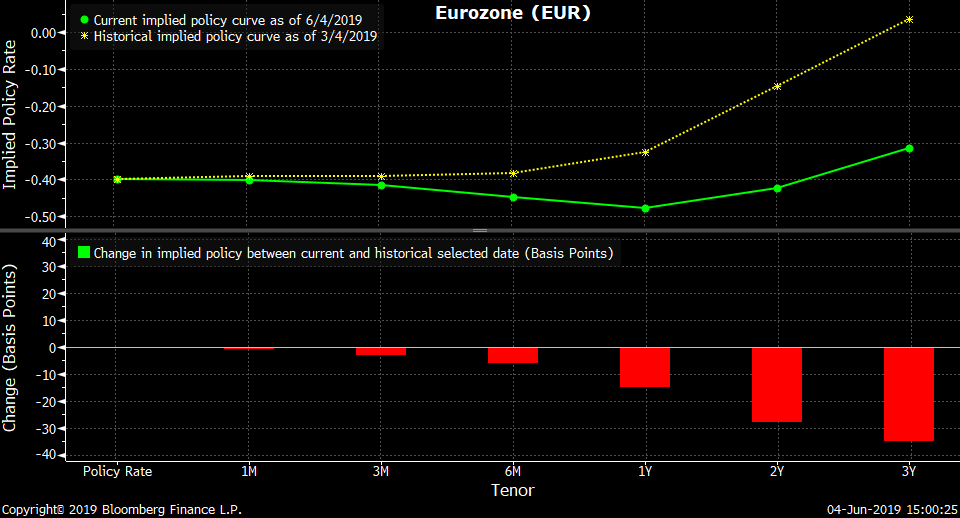 Chart 1: Pricing for ECB policy rates fell across the curve over the last three years, indicating much of the dovish shift of ECB policy is already priced in.'