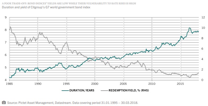 The duration of the Barclays Global Aggregate Index for instance – one of the most widely used bond indices – has climbed to 7.0 years, from 5.4 years a decade ago.