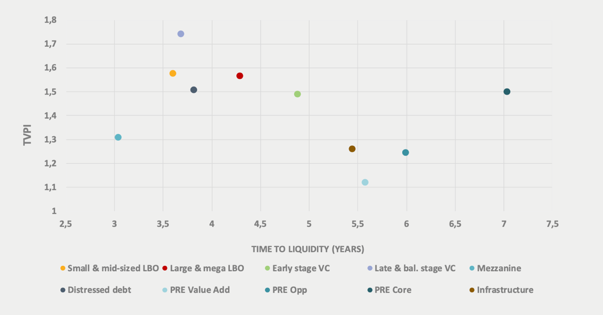 Fig. 2 – Multiple of invested capital and time-to-liquidity of private markets funds