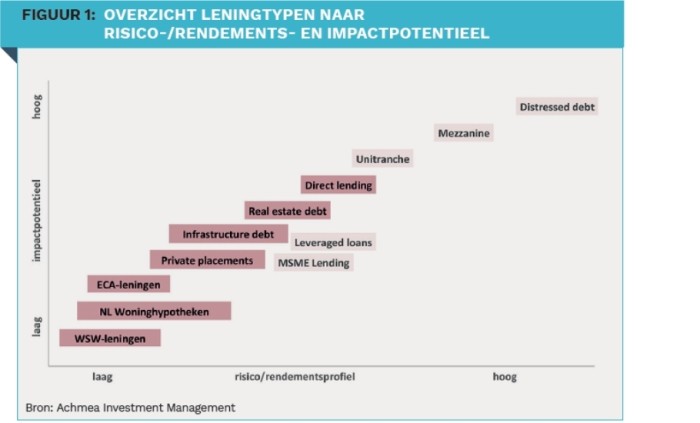 In Figure 1, we distinguish between the various types of loans, plotted according to risk-return profile and impact potential. Direct lending is by far the largest category within private debt, but we also invest in infrastructure debt and real estate debt. Private placements are mainly loans to companies with a (sub) investment grade rating. These are often companies in the upper middle market segment. Loans to these companies can, for example, serve specific sustainability or impact purposes. WSW loans are loans to Dutch housing associations with an explicit government guarantee. Together with Dutch mortgages, these loans offer opportunities to make an impact on issues such as climate and equal opportunities. Due to the government guarantee, WSW loans have a high credit rating. ECA loans also have a government guarantee and aim to promote and stimulate trade flows. Distressed debt and mezzanine are not our preferred option due to the (very) risky nature of these loans and their similarities with private equity.'