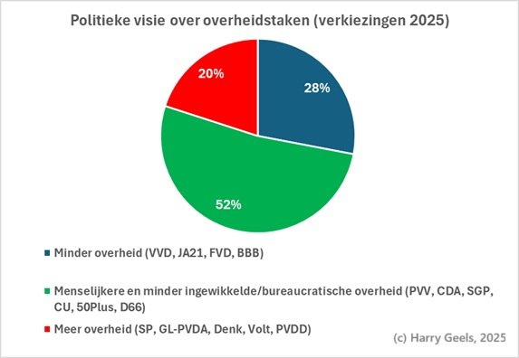 Samen vertegenwoordigen de eerste twee groepen — die dus een andere overheid willen — ongeveer 80% van de Kamer. Dat betekent niet dat iedereen op alle taken een kleinere overheid wil, maar wel dat er brede steun is voor vereenvoudiging en modernisering. Deze indeling sluit opvallend goed aan bij mijn eerdere analyse van politieke ideologieën in vier kwadranten: de rechterkwadranten een kleinere, effectievere overheid, het midden een efficiëntere of menselijkere overheid, links meer overheid.