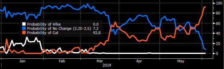 Hieronder volgt een commentaar in het Engels van Bart Hordijk, valuta-analist bij Monex Europe, op de financiële markten die een renteverlaging in de VS in september inprijzen. Lagere inflatie, handelsoorlogen en een Amerikaanse economie die lijkt af te remmen; allemaal redenen waarom markten rekening houden met een dovish Fed. Voor september wordt de kans op een renteverlaging vrijwel als een zekerheid gezien met een kans van 92%.