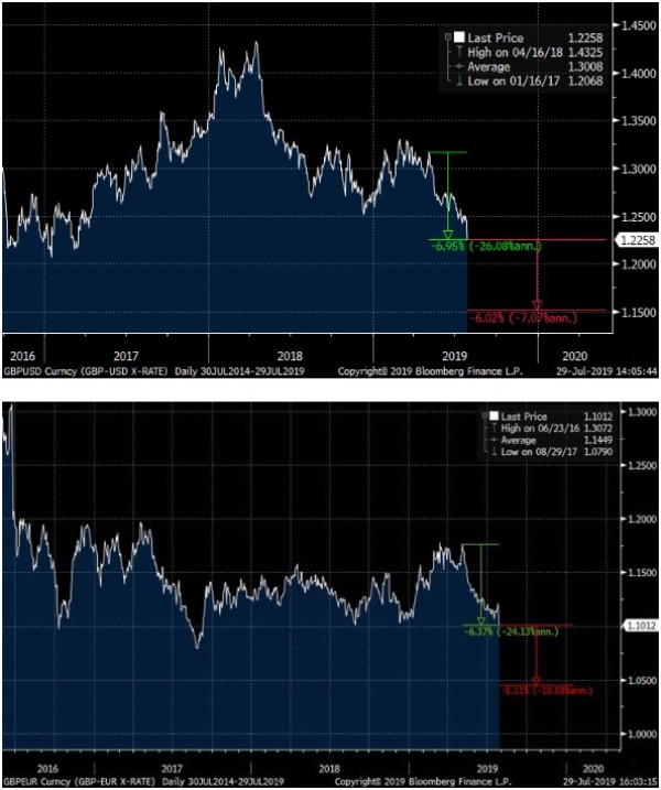 De nieuwe Britse premier Boris Johnson en de Europese Unie liggen op ramkoers, waarbij voorlopig het Britse pond het stootkussen lijkt dat de eerst klappen opvangt, stelt Bart Hordijk, valuta-analist bij Monex Europe.