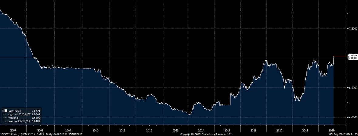 Hieronder volgt een commentaar in het Engels van Bart Hordijk, valuta-analist bij Monex Europe, op de Chinese yuan die de psychologische èn historische grens van 7.00 heeft gebroken op USDCNY. Dit brengt de People’s Bank of China in een lastig parket, waarbij een zwakkere yuan gebruikt kan worden als een signaal dat China bereidt is om met alle mogelijke middelen terug te vechten tegen de Amerikaanse tarieven. Tegelijkertijd is een zwakkere munt voor China eigenlijk helemaal niet congruent met andere doelen, zoals het openen van de obligatiemarkt, het wegbewegen van de maakindustrie naar een consumenten gedreven economie en het voorkomen van kapitaalvlucht.