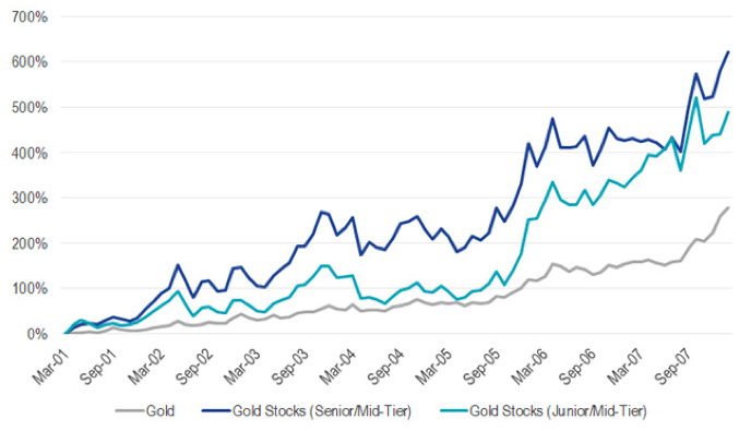 Deze grafiek geeft de spectaculaire prestatie weer van goudaandelen tijdens de haussemarkt van 2001 – 2008: