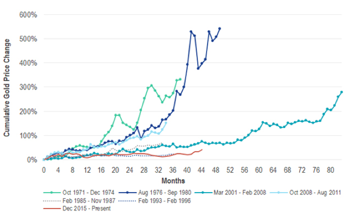 Een vergelijking met voorafgaande meerjarige periodes van stijgende goudprijzen (of losjes gedefinieerd ‘haussemarkten’) kan een idee geven van welke richting de markt opgaat. Onderstaande grafiek vergelijkt een aantal haussemarkten voor goud van de afgelopen vijftig jaar die geklasseerd staan als ‘seculier’ (lange termijn) of ‘cyclisch’ (korte termijn en die plaatsvinden binnen een meerjarige periode van dalende goudprijzen of een ‘baissemarkt’). De goudprijs doorliep sinds 2015 hetzelfde patroon als tussen 1993 en 1996 wat een cyclische haussemarkt was. VanEck is echter van mening dat sinds juni de prijstrend meer lijkt te wijzen op de seculiere haussemarkt van tussen 2001 en 2008.