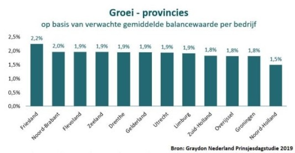 Op regionaal niveau voorspelt Graydon net als vorig jaar de sterkste groei voor bedrijven in de provincie Friesland (2,2%), gevolgd door Noord-Brabant (2,0%) en Flevoland (1,9%). Waar Friesland opvalt door een groeiverwachting ruim boven het landelijk gemiddelde van 1,8 procent, valt Noord-Holland op in omgekeerde zin, waar de groeiverwachting met 1,5 procent het minst is van alle provincies.
