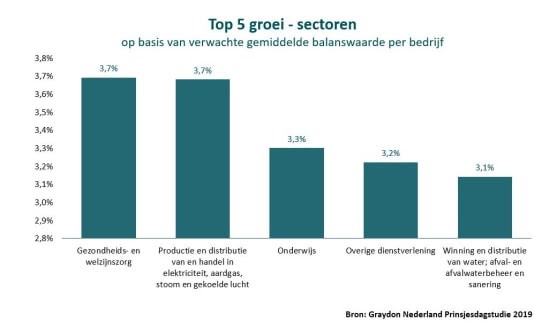 Het totale Nederlandse bedrijfsleven groeit volgend jaar met gemiddeld 1,8 procent. Alle sectoren kunnen volgend jaar een groei op het balanstotaal tegemoet zien, maar de cijfers laten wel onderlinge verschillen zien. De Energie- en Zorgsector hebben met 3,7 procent de grootste groeiverwachting, gevolgd door het Onderwijs (3,3%), de Overige Dienstverlening (3,2%) en de Water- en afvalverwerking (3,1%).