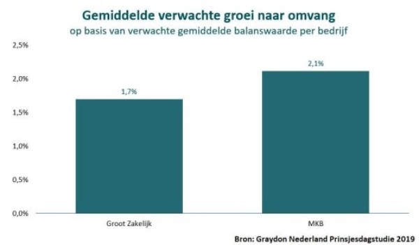 Voor dit onderzoek heeft Graydon ook in kaart gebracht wat de groeiverwachtingen zijn op het balanstotaal voor zowel de Groot Zakelijke bedrijven als het MKB. Bij ruim 124 duizend bedrijven ziet Graydon dat op basis van de verwachte gemiddelde balanswaarde per bedrijf de Groot Zakelijke bedrijven zullen groeien met 1,7 procent, terwijl het MKB kan rekenen op een toename van het balanstotaal met 2,1 procent.