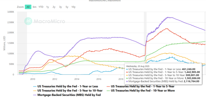 Daarnaast is de Fed (net als ECB) nog steeds Quantitative Easing aan het afbouwen. De 10y en langere treasury holdings zijn echter aan het groeien. Dit komt neer op de achterkant van de US yield curve naar beneden duwen (vraag) in combinatie met minder uitgave aan de aanbodkant.
