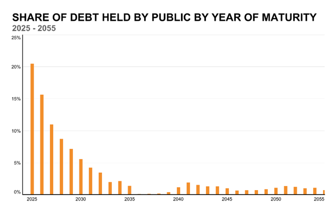Wat mij betreft illustreren de onderstaande figuren uitstekend wat er aan de hand is. Aan de ene kant is de maturity mix van Amerikaans schuldpapier (US Treasuries) de afgelopen jaren aanzienlijk verkort. Deze verkorting geeft nu een iets lagere rente(last) op de staatschuld, maar brengt natuurlijk een gigantisch herfinancieringsrisico met zich mee.