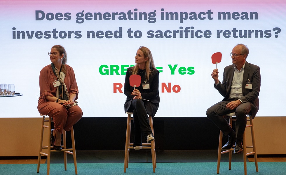 De vraag of impactbeleggen lagere rendementen oplevert, zorgt voor de meeste reuring in de zaal. Kool vraagt het publiek kleur te bekennen, en het gros steekt een rode kaart omhoog: nee, impact mag niet ten koste gaan van rendement.