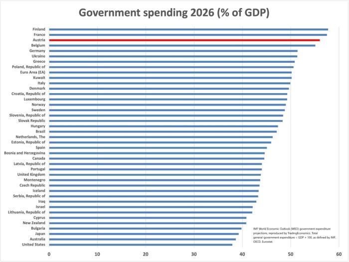 Hoe groot de verschillende overheden inmiddels zijn, uitgedrukt als overheidsuitgaven van het bbp, is te zien in Figuur 1. Bij diverse landen beslaat de overheid al meer dan de helft van het bbp. Dat kan je onmogelijk nog neoliberale landen noemen. Sommige libertariërs spreken bij een overheid die groter is dan 15% van het bbp al van een socialistisch systeem. Mark Rutte noemde Nederland ooit eens (terecht) een ‘diep socialistisch land’. De VS nadert overigens ook al rap de 40%-grens.