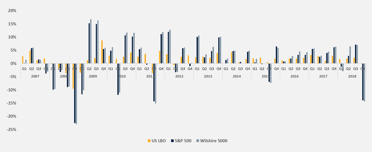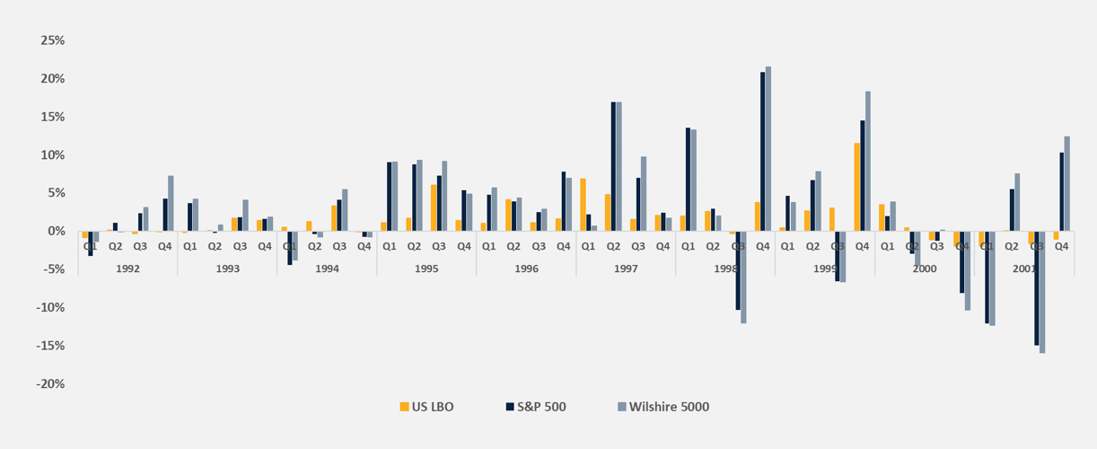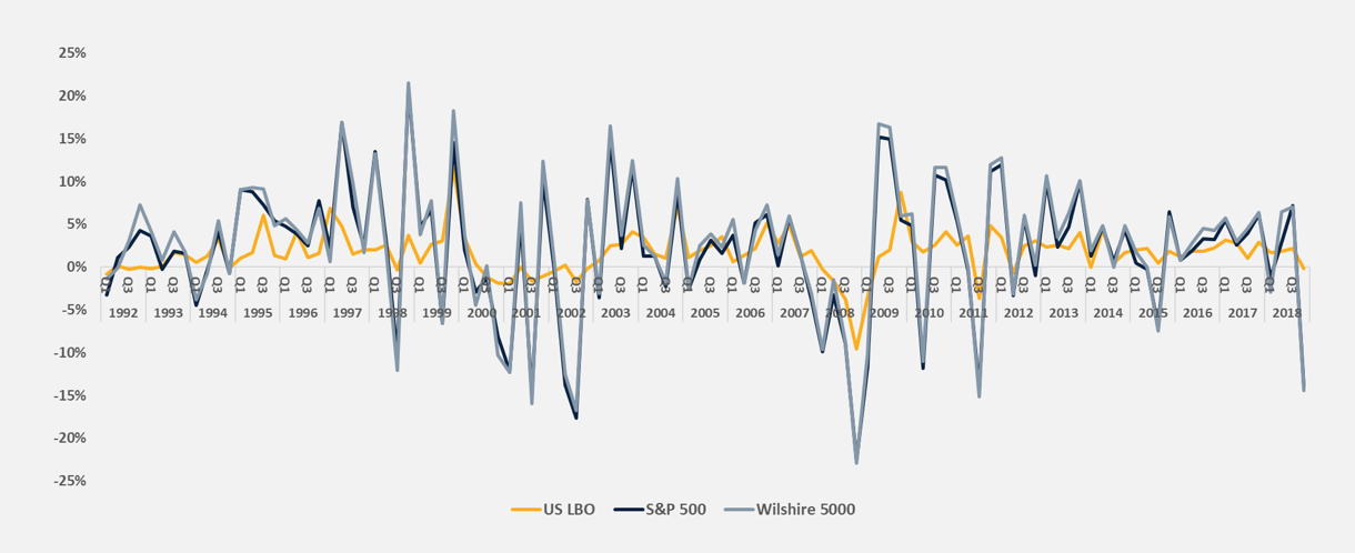 In analyzing the evolution of returns of public and private markets, the first layer is to compare the volatilities of the two. During the entire period from 1992 to 2018, the standard deviation of US LBO funds’ performance was 0.0254. At the same time, the standard deviation of S&P 500 was exactly three times larger. Figure 1 shows that US LBO funds’ quarterly change in TVPI fluctuates much less than the returns on S&P 500 and Wilshire 5000 public market indices.